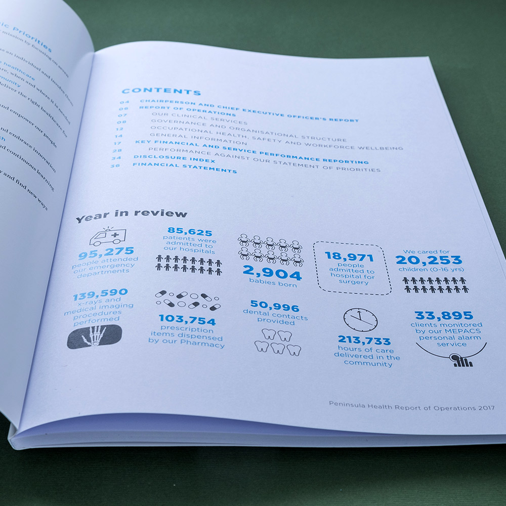 I created minimalist infographics, used clean typesetting and design, and used colour sparsely to reinforce a local health service’s visual identity.